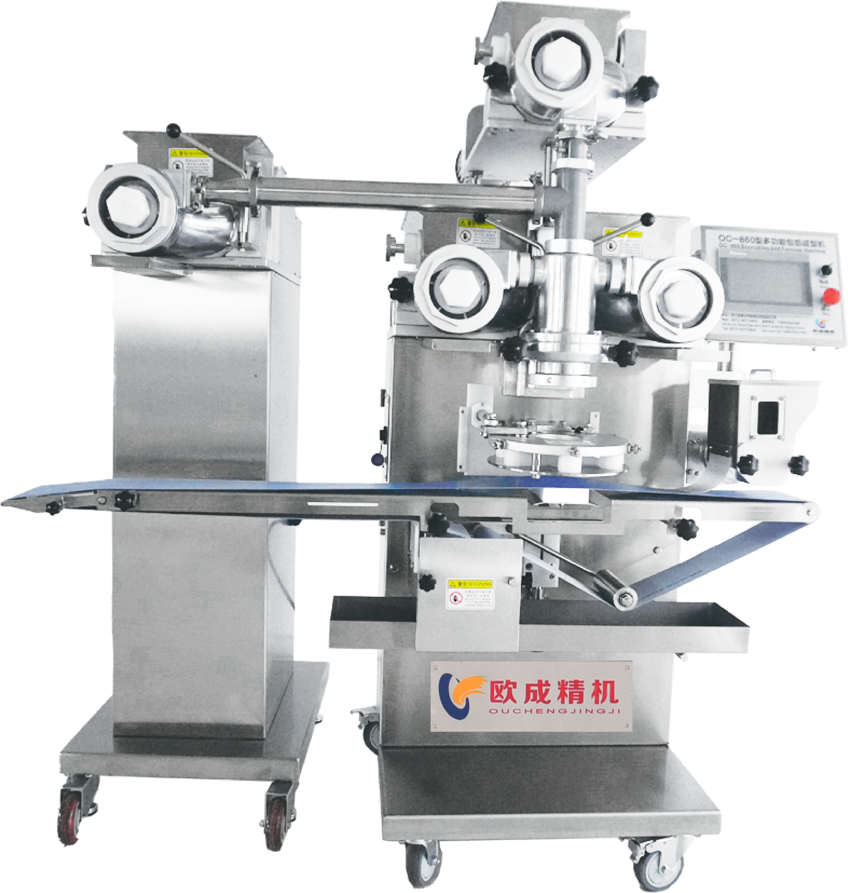Ideal for large-scale commercial bakeries and industrial food production facilities producing filled products including steamed buns (baozi), mooncakes, filled pastries, mochi, dumplings, croquettes, kibbeh, arancini, puff pastries, cream-filled bread, and other encrusted products. The four-hopper configuration is perfect for high-volume operations requiring multiple product varieties simultaneously or maximum production capacity of 60-120 pieces per minute with 10-100g product range. Ideal for production lines serving multiple markets or product lines.