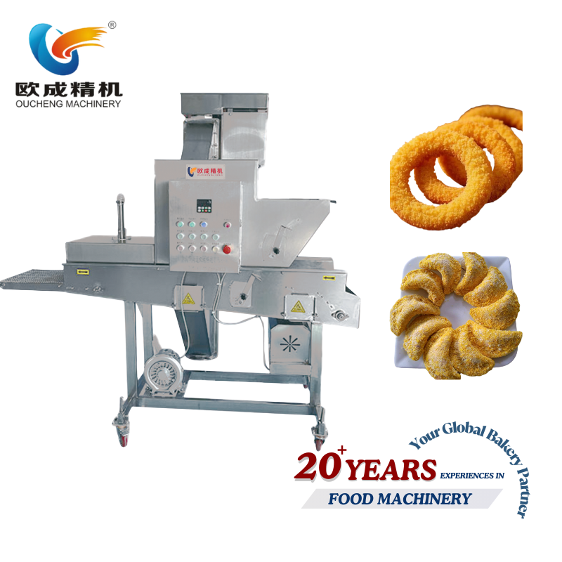 Ideal for high-volume bakery and food processing operations producing breaded products including chicken nuggets, fish fillets, vegetable cutlets, breaded pastries, coated snacks, and specialty bread products. Perfect for facilities requiring consistent breadcrumb, flour, or snowflake coating at industrial scale with variable speed control and labor-saving automation.