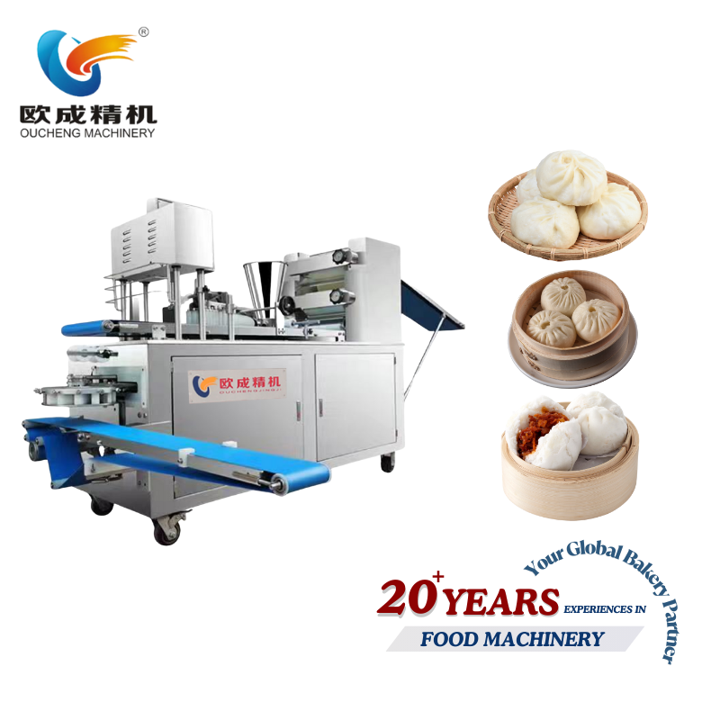The OC-661 Steamed Bun Machine is a versatile dual-function production line capable of producing both filled steamed buns (baozi) and plain steamed bread (mantou) with exceptional efficiency. The imitation handmade design includes a specialized knife for cutting steamed buns, creating authentic handcrafted appearance at industrial speeds. The touchscreen operation interface provides clear display, stable performance, and easy operation with an accurate control system. The machine ensures uniform dough wrapping, precise portioning, and adjustable dough-to-filling ratio and production speed to meet diverse production requirements.