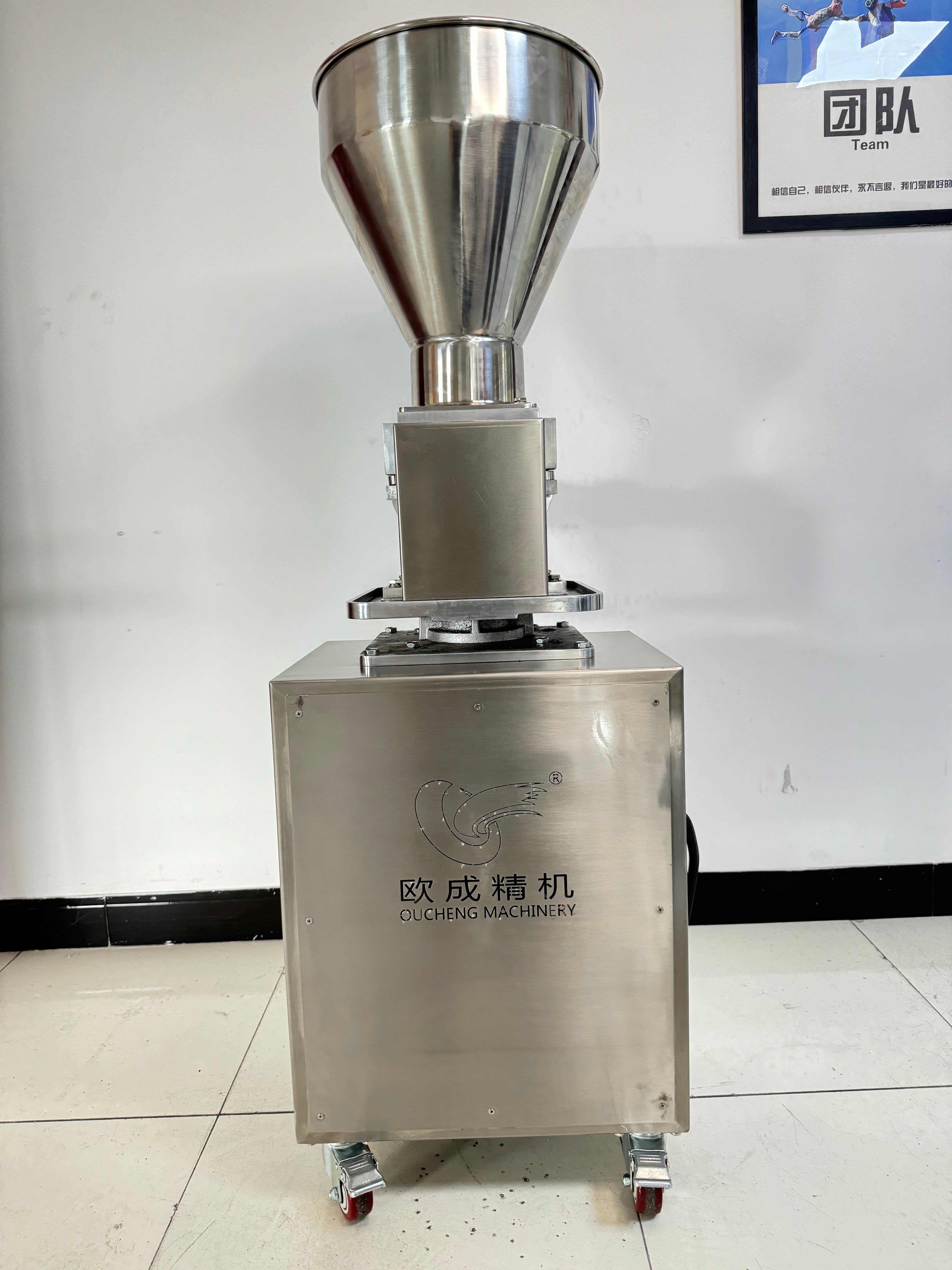 Fillings are placed into the filling hopper and fed downward by a vertical stirring blade. They are then automatically dispensed by a food-grade stainless steel screw rod, ensuring consistent portion control and smooth operation. The vertical design allows gravity to assist the feeding process, making it ideal for various filling consistencies from smooth pastes to chunky preserves.